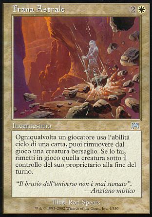 DESCRIZIONE: Ogniqualvolta un giocatore usa l'abilità ciclo di una carta, puoi esiliare una creatura bersaglio. Se lo fai, rimetti la carta esiliata sul campo di battaglia sotto il controllo del suo proprietario all'inizio della prossima sottofase finale. RARITA': COSTO: 2B "ENGLISH: Astral Slide