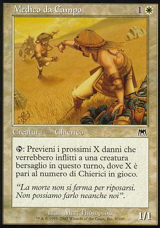DESCRIZIONE: {TAP}: Previeni i prossimi X danni che verrebbero inflitti a una creatura bersaglio in questo turno, dove X è pari al numero di Chierici sul campo di battaglia. RARITA': COSTO: 1B "ENGLISH: Battlefield Medic