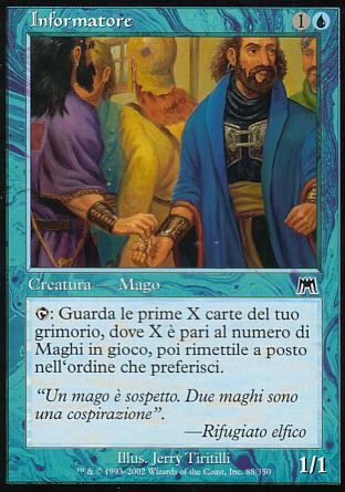 DESCRIZIONE: {TAP}: Guarda le prime X carte del tuo grimorio, dove X è pari al numero di Maghi nel campo di battaglia, poi rimettile a posto in un qualsiasi ordine. RARITA': COSTO: 1L "ENGLISH: Information Dealer