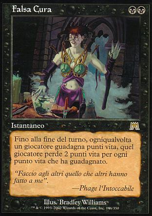 DESCRIZIONE: Fino alla fine del turno, ogniqualvolta un giocatore guadagna punti vita, quel giocatore perde 2 punti vita per ogni punto vita che ha guadagnato. RARITA': COSTO: NN "ENGLISH: False Cure