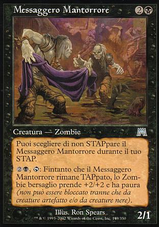 DESCRIZIONE: Puoi scegliere di non STAPpare il Messaggero Mantorrore durante il tuo STAP. ; {2}{N}, {TAP}: Una creatura Zombie bersaglio prende +2/+2 e ha paura fintanto che il Messaggero Mantorrore rimane TAPpato. RARITA': COSTO: 2N "ENGLISH: Frightshroud Courier