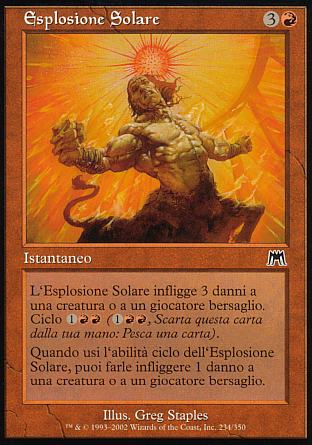 DESCRIZIONE: L'Esplosione Solare infligge 3 danni a un qualsiasi bersaglio. ; Ciclo {1}{R}{R} ; Quando cicli l'Esplosione Solare, puoi farle infliggere 1 danno a un qualsiasi bersaglio. RARITA': COSTO: 3R "ENGLISH: Solar Blast