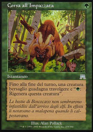 DESCRIZIONE: Fino alla fine del turno, una creatura bersaglio guadagna travolgere e "{V}: Rigenera questa creatura". RARITA': COSTO: V "ENGLISH: Run Wild