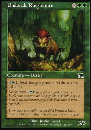 DESCRIZIONE: {2}{V}: Una creatura Bestia bersaglio prende +1/+1 fino alla fine del turno. ; Metamorfosi {1}{V}{V} RARITA': COSTO: 2VV "ENGLISH: Snarling Undorak