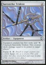 DESCRIZIONE: La creatura equipaggiata ha attacco improvviso e "{TAP}, Togli il Tridente Colposicuro: Questa creatura infligge un ammontare di danni pari alla propria forza a un giocatore o a un planeswalker bersaglio." ; Equipaggiare {4} ({4}: Assegnalo a una creatura bersaglio che controlli. Equipaggialo solo come una stregoneria. Questa carta entra nel campo di battaglia non assegnata e resta sul campo di battaglia se la creatura lo lascia.) RARITA': COSTO: 2 "ENGLISH: Surestrike Trident