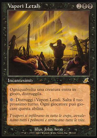 DESCRIZIONE: Ogniqualvolta una creatura entra nel campo di battaglia, distruggila. ; {0}: Distruggi i Vapori Letali. Salta il tuo prossimo turno. Qualsiasi giocatore può attivare questa abilità. RARITA': COSTO: 2NN "ENGLISH: Lethal Vapors
