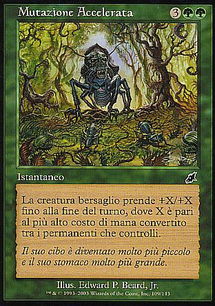 DESCRIZIONE: Una creatura bersaglio prende +X/+X fino alla fine del turno, dove X è il maggiore costo di mana convertito tra i permanenti che controlli. RARITA': COSTO: 3VV "ENGLISH: Accelerated Mutation